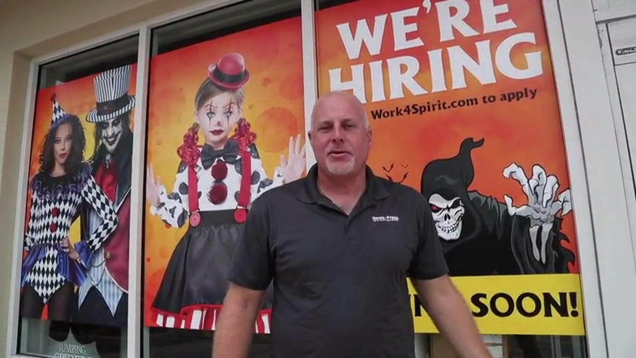 A Hiring Sign For Workers Posted In The Window Of A Spirit Halloween Pop Up Store Seen In The Midtown Neighborhood Of New York Stock Photo Alamy